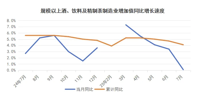 近日,国家统计局网站发布7月份规模以上工业企业生产数据。数据显示,7月当月酒、饮料和精制茶制造业工业增加值同比增长0.1%,1-7月累计同比增长4.1%。