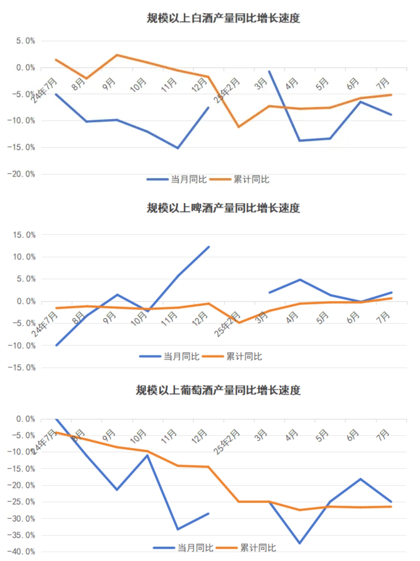 具体来看:7月规模以上工业白酒产量23.6万千升,同比下降8.9%;1-7月累计产量214.6万千升,同比下降5.2%。单月降幅较上月扩大2.4个百分点,累计降幅则收窄0.6个百分点。