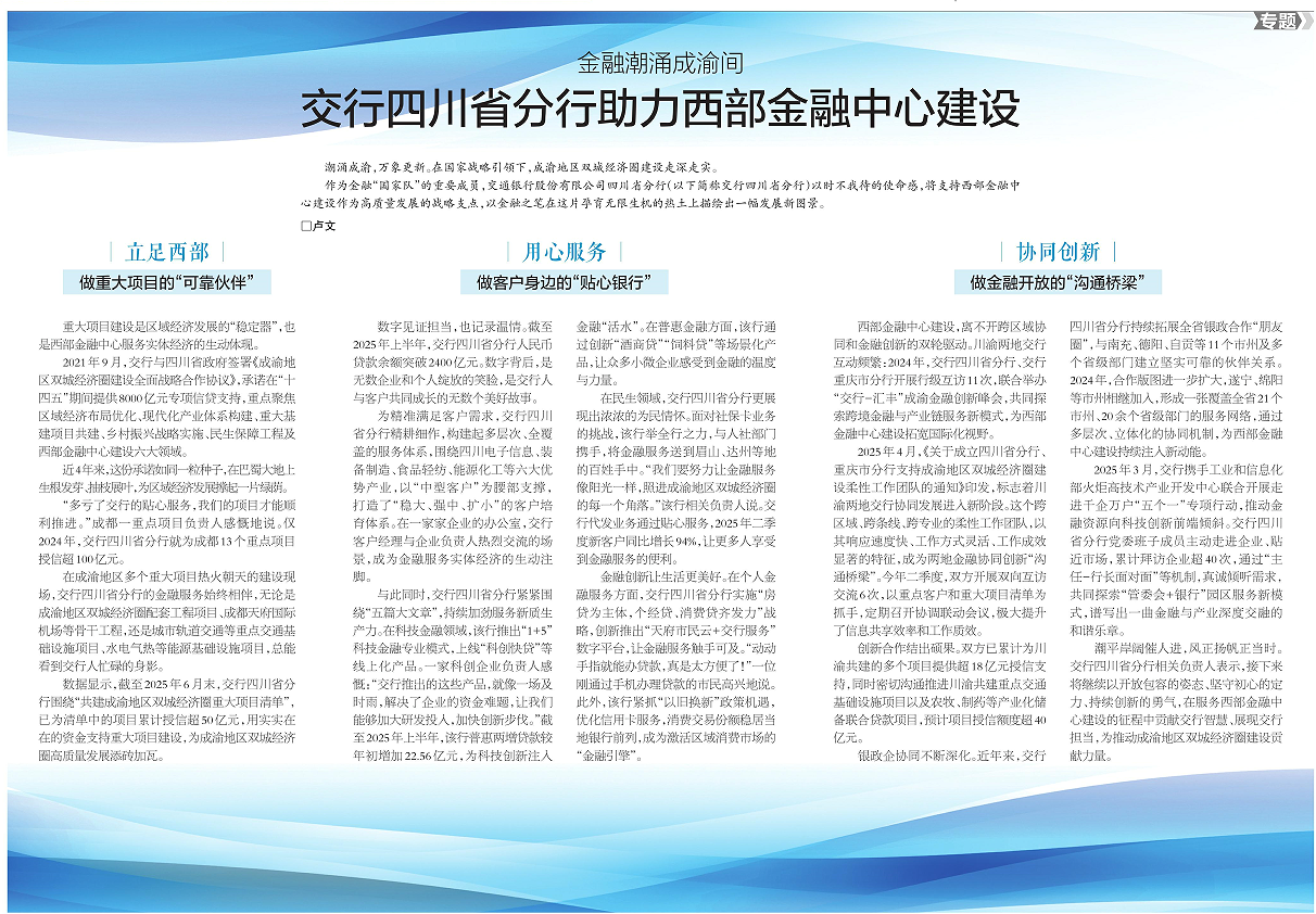 数据显示,截至2025年6月末,交行四川省分行围绕“共建成渝地区双城经济圈重大项目清单”,已为清单中的项目累计授信超50亿元,用实实在在的资金支持重大项目建设,为成渝地区双城经济圈高质量发展添砖加瓦。