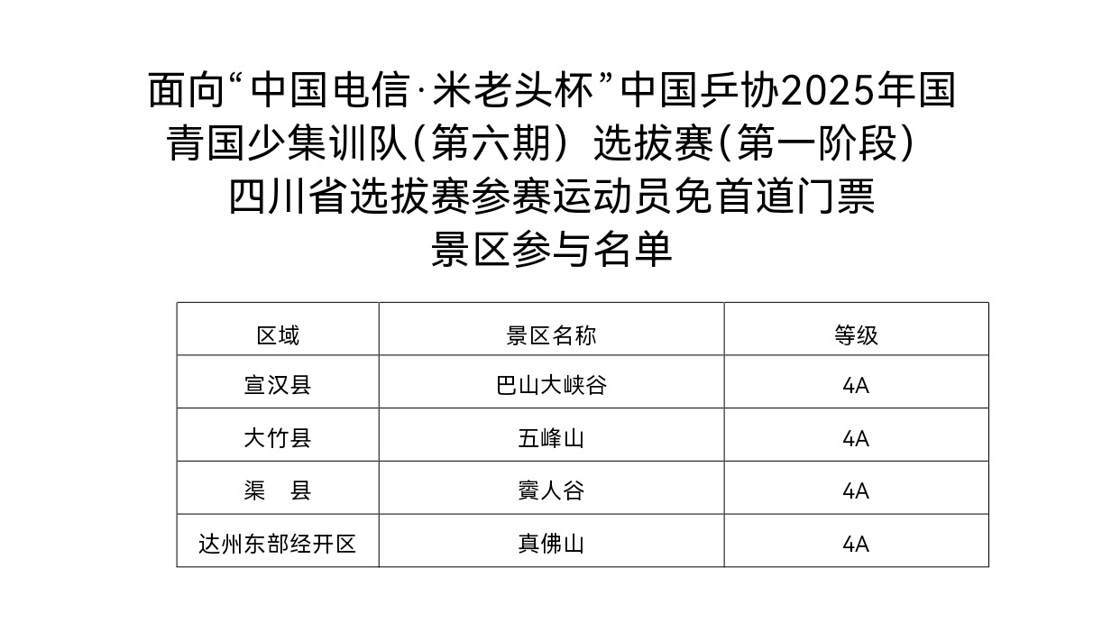 8月26日,达州市文化体育和旅游局发布《关于对“中国电信·米老头杯”中国乒协2025年国青国少集训队(第六期)选拔赛(第一阶段)四川省选拔赛参赛运动员开展景区门票优惠活动的通知》称,为进一步推动体育与旅游融合发展,借助重大体育赛事活动提升文旅影响力,经研究决定,8月26日至2025年9月1日,对“中国电信·米老头杯”中国乒协2025年国青国少集训队(第六期)选拔赛(第一阶段)四川省选拔赛参赛运动员、教练员、裁判员实行A级旅游景区免首道门票优惠活动。