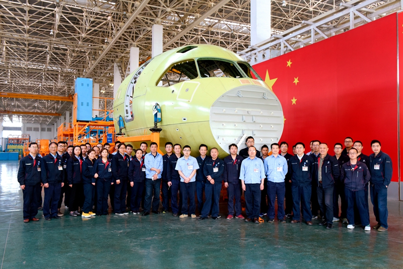 成飞民机工人与他们生产的C919大飞机机头(摄影:陈燮)
