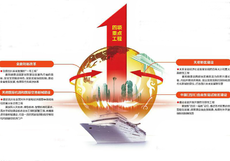 中共四川省委十一届二次全会提出,实现宏伟蓝图,必须突出抓好全面创新改革、天府新区建设、天府国际机场和国际空港新城建设、中国(四川)自由贸易试验区建设“四项重点工程”。