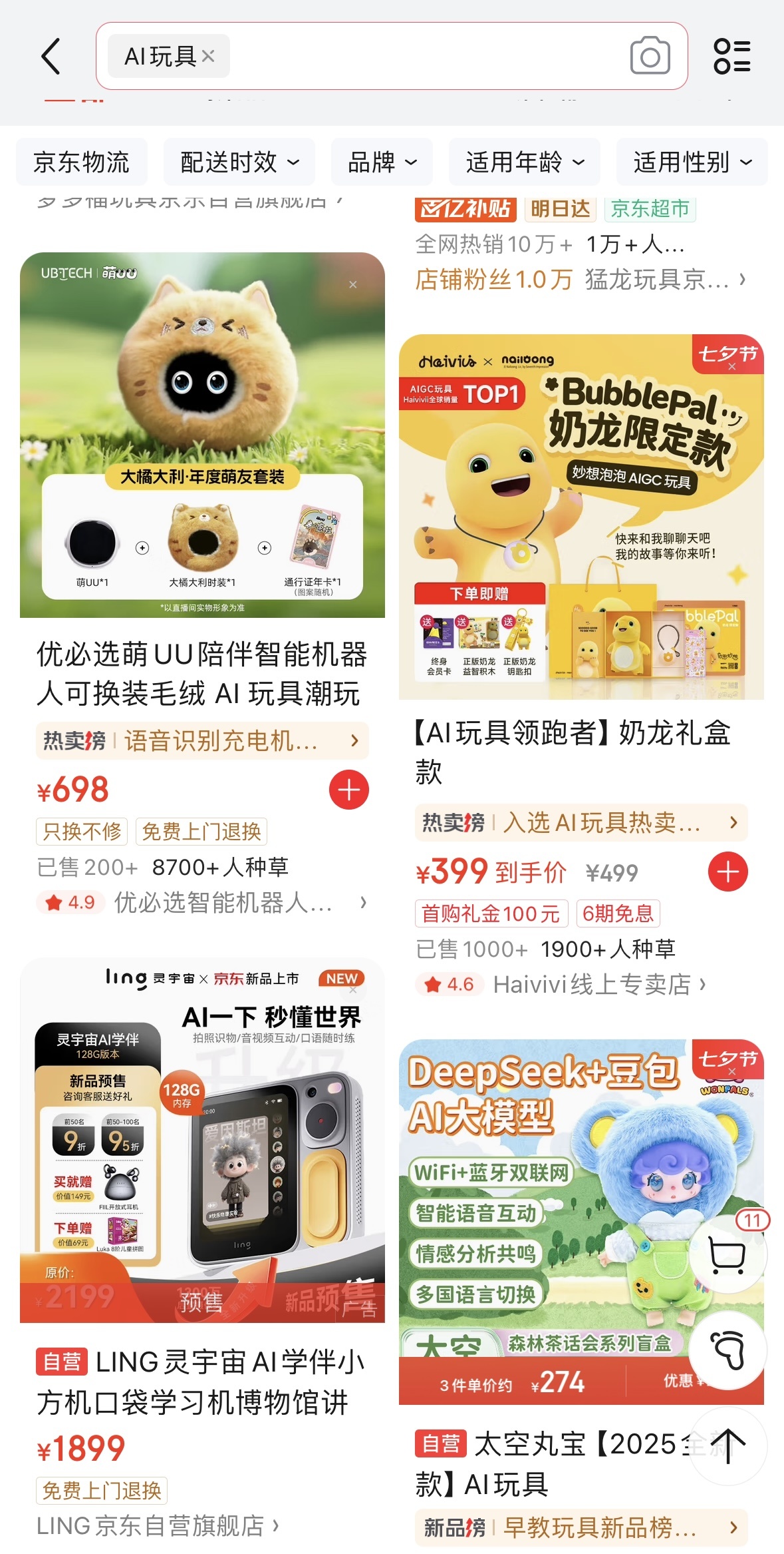 打开淘宝、京东App,记者搜索发现,现在市面上的AI玩具主要有AI毛绒玩具、AI挂件玩具、动漫IP玩具和AI群机器人玩具等产品形态。价格从几百元到数千元不等。其中,AI毛绒玩具、AI早教机、AI宠物等品类下单率较高。