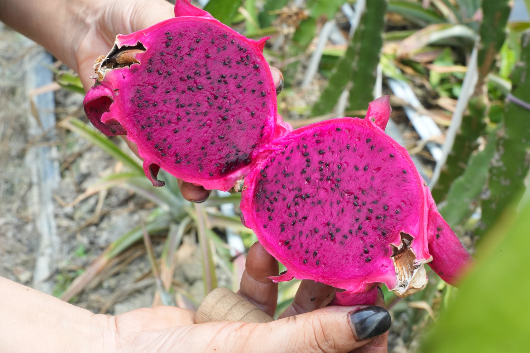 “园内共种植了4亩热带水果,今年首次挂果,预计亩产可达2000斤左右。”邓杨勤介绍,其中,多种特色品种格外引人注目,“比如‘以色列’黄龙果,它果皮金黄、鳞片细尖,切开后果肉呈燕窝丝状,甜度能达到18%以上。”她一边剪黄龙果一边告诉记者。而“粉红佳人” 火龙果的果皮虽与普通火龙果差别不大,但果肉是粉白相间的,咬一口又甜又多汁。