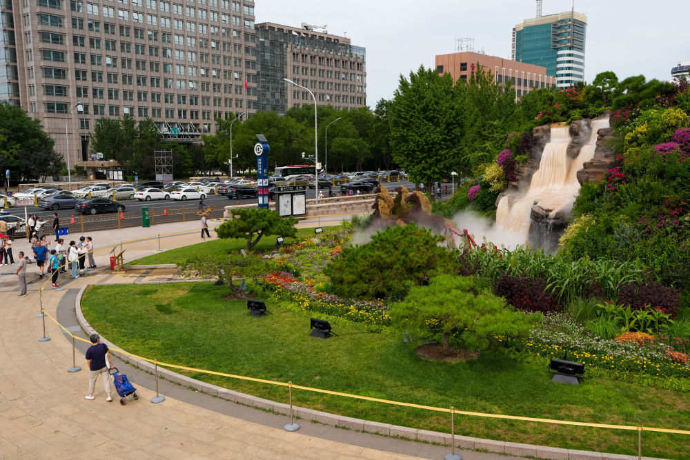 ↑ 8月26日,人们在北京复兴门参观“美好明天”花坛。