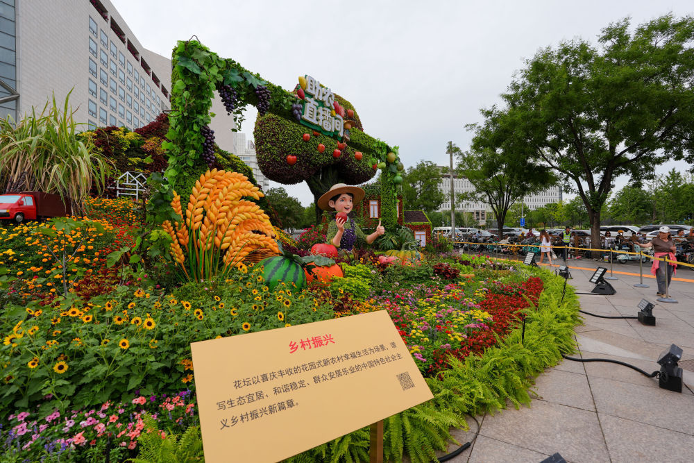 ↑ 8月26日,人们在北京西单参观“乡村振兴”花坛。