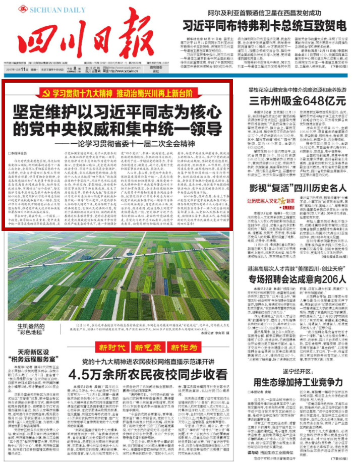 初心如磐,使命在肩。全省上下务必把坚定维护党中央权威和集中统一领导体现到贯彻党的十九大精神上来,体现到落实省委十一届二次全会的决策部署上来,从党和人民根本利益出发,继续埋头苦干、扎实工作,奋力谱写新时代实现中华民族伟大复兴中国梦的四川篇章!