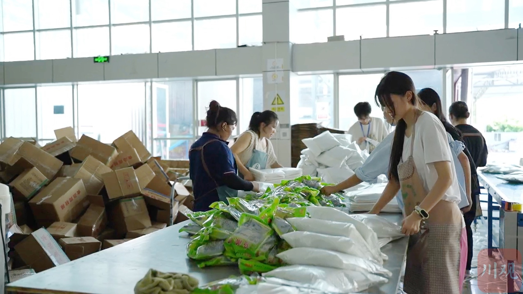 走进榆小七公司成品间,靠墙的货架不算宽敞,萝卜干、苕皮、宜宾燃面、火锅粉等农特产却码得满满当当;隔壁分拣中心里,几名工作人员正手脚麻利地打包,将封装好的货品按区域分堆。