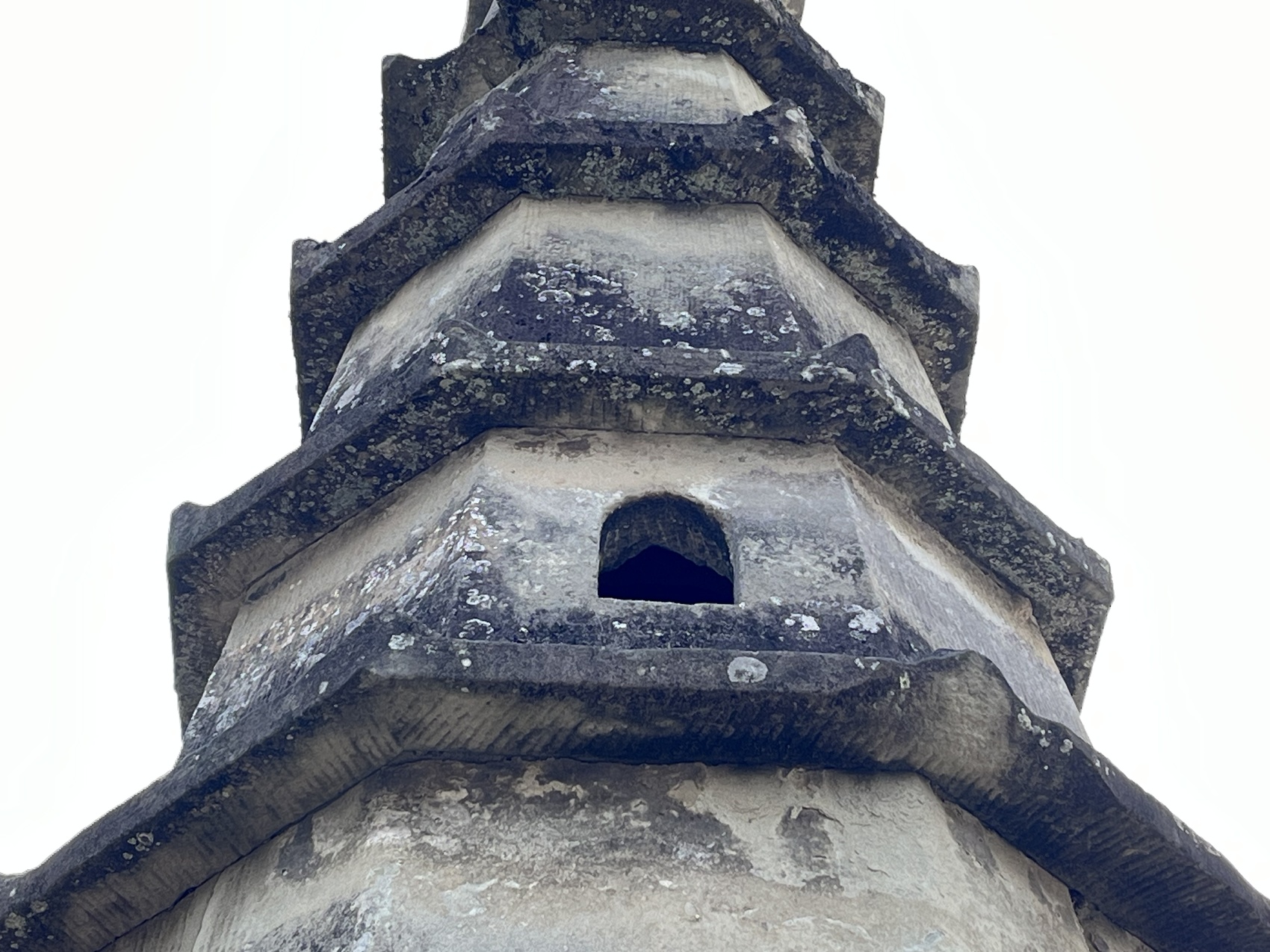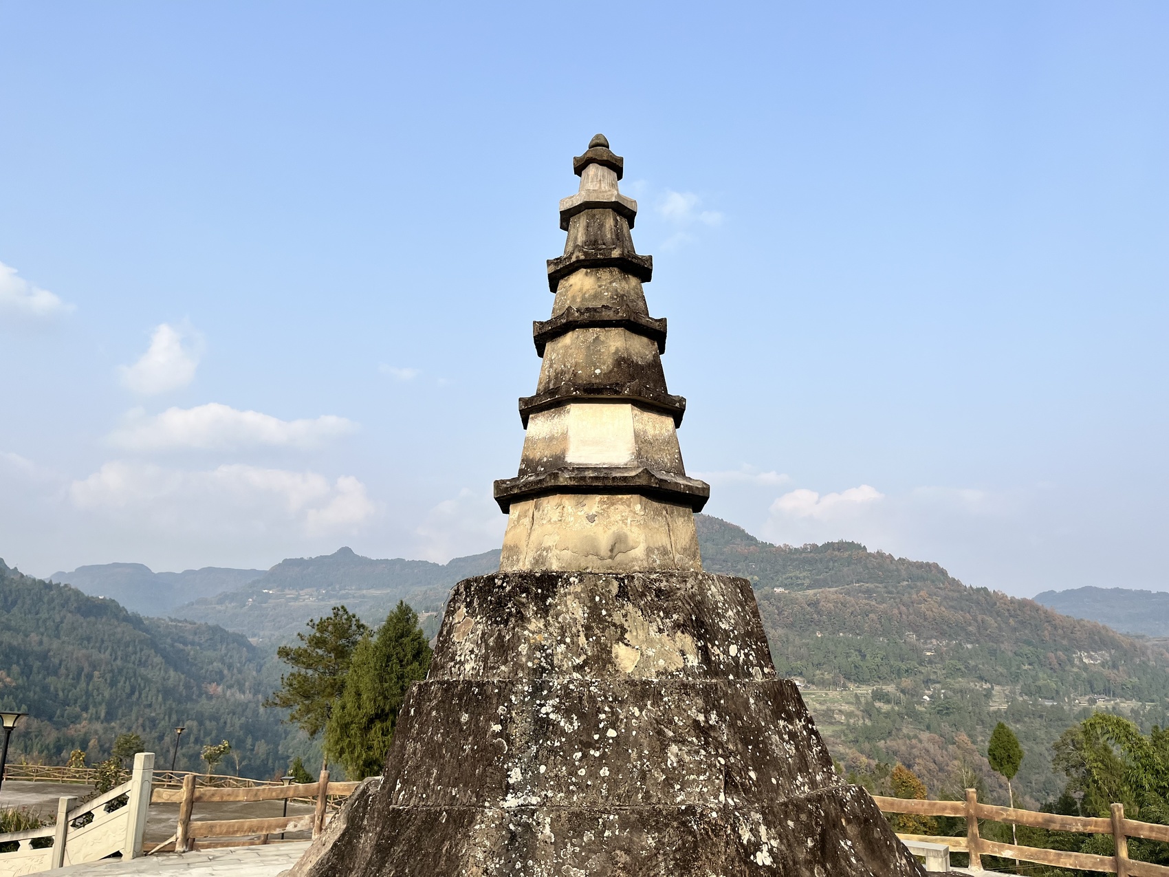 这座塔位于通川区石家坝,背倚鸡公岭,下临印河水,正对平昌县群山之巅,与张氏祠堂、祖坟、老院遗迹共同构成一幅传统村落的文化图景。石塔通高8.5米,共九级,下部三层由天然巨石雕凿而成,坚实粗犷;上部六层则以灰白砂岩砌成仿木楼阁式空心塔,挺拔清秀。塔顶为葫芦造型,曾经垮塌,后经修复,如今整体基本保存完好。