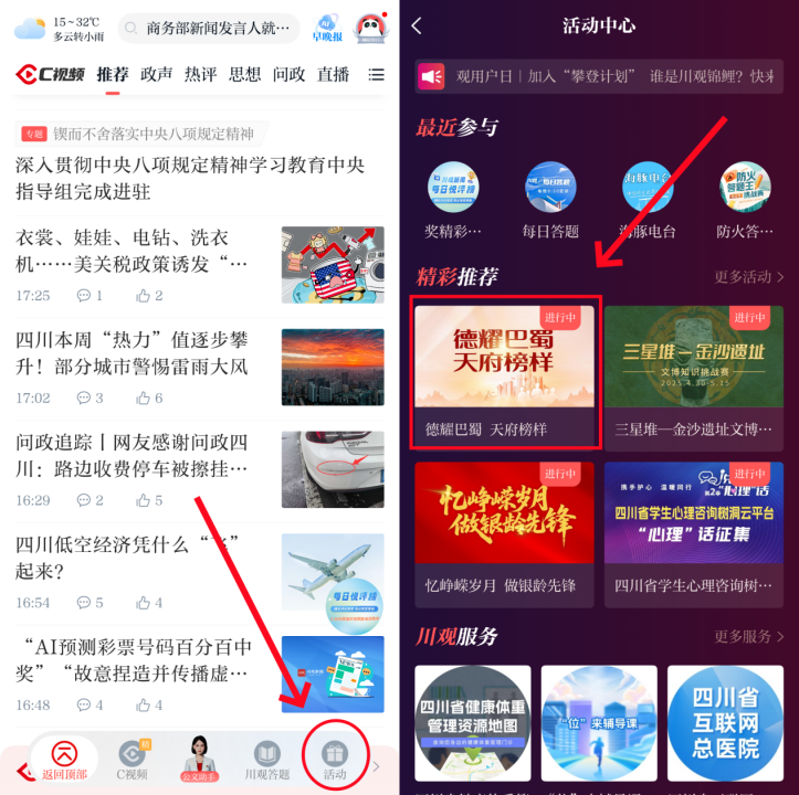 在川观新闻首页,点击右下角“活动”,进入到“活动中心”,找到“德耀巴蜀 天府榜样”活动图片即可进入“善举随手拍”提交线索,点击“微光成炬”即可观看作品内容,收获满满正能量。