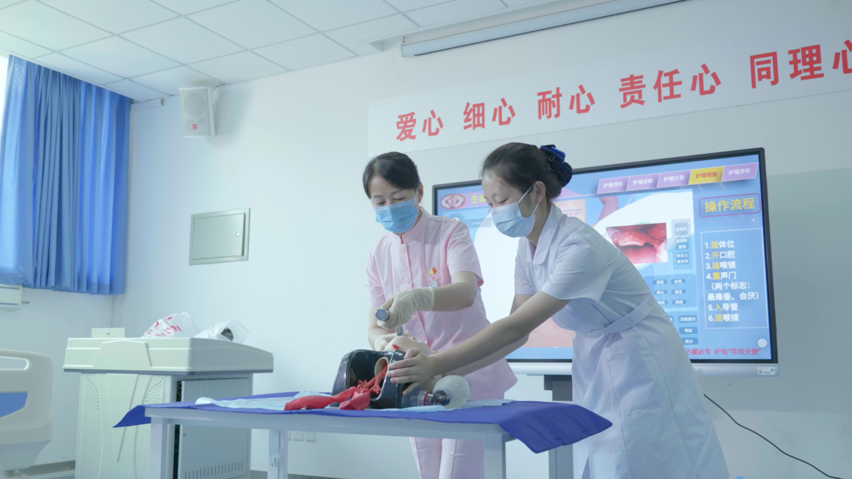 缪礼红(左)在上新生儿窒息救护技能实训课