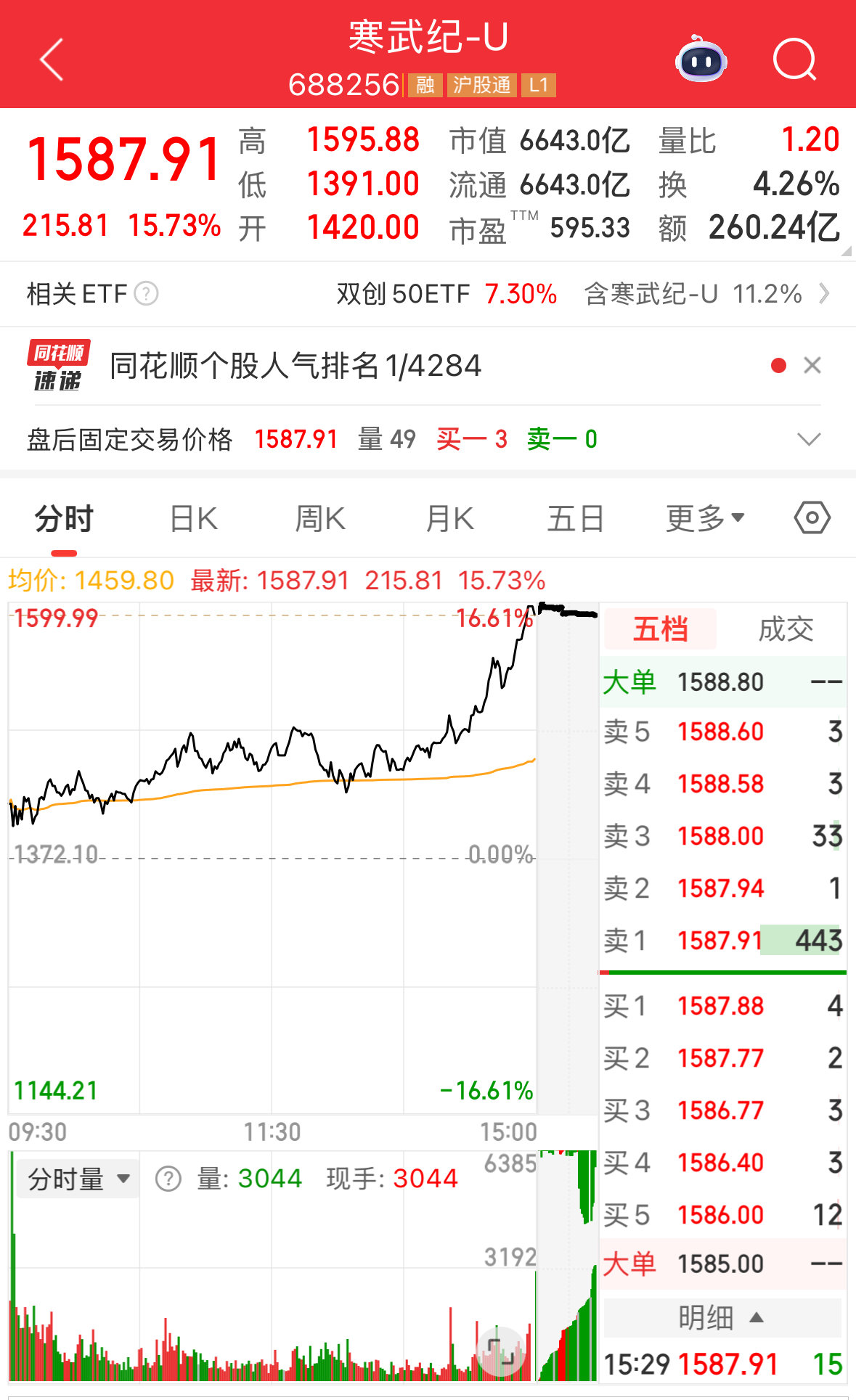交易行情显示,8月28日,寒武纪高开3.49%,开盘后公司股价震荡上行。尾盘期间,公司股价拉升走高,盘中一度触及1595.88元/股高点,再创历史新高。截至当日收盘,公司股价收涨15.73%,收于1587.91元/股,总市值6643亿元,当日成交金额260.24亿元。