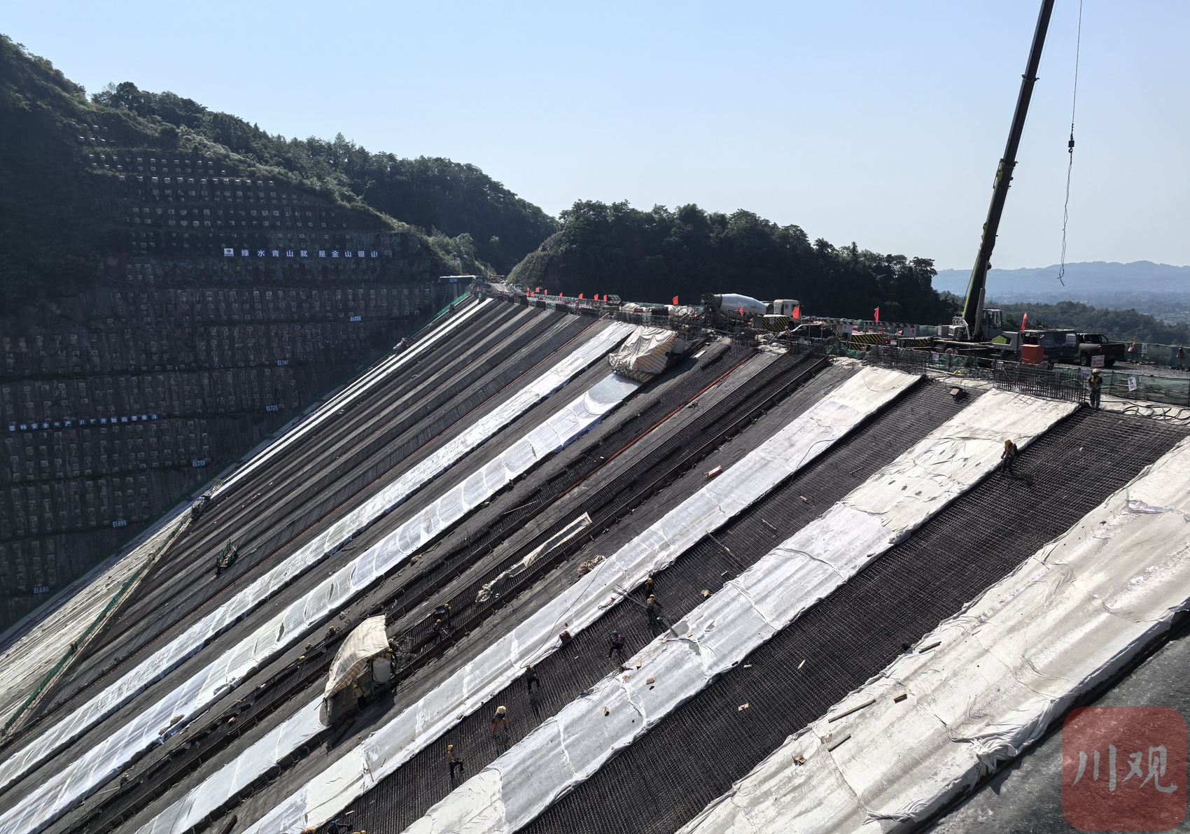“我们采用了‘分序跳仓、先奇后偶、无轨滑模一次成型、雨天覆盖防护’的混凝土浇筑思路。”成都市李家岩开发有限公司相关负责人介绍,团队同时还结合工序清单管理、每日碰头总结、24小时旁站监督的闭环管理机制,成功攻克了“高温汛期不利面板浇筑”等技术难题。