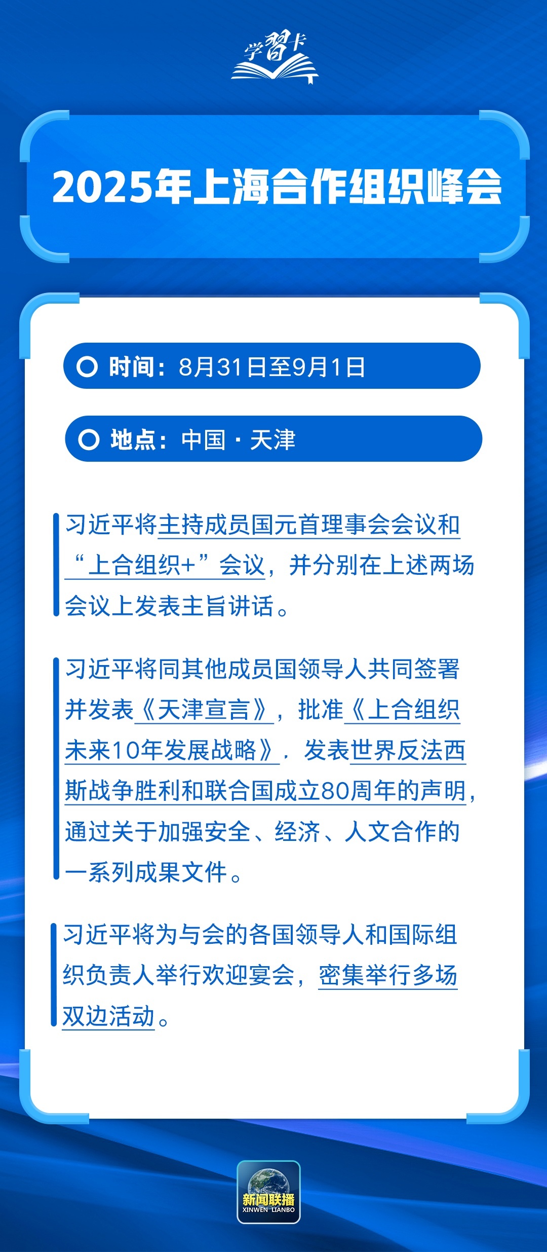 8月31日至9月1日,2025年上海合作组织峰会将在天津举行。这是中国第五次主办上合组织峰会,也是上合组织成立以来规模最大的一次峰会。