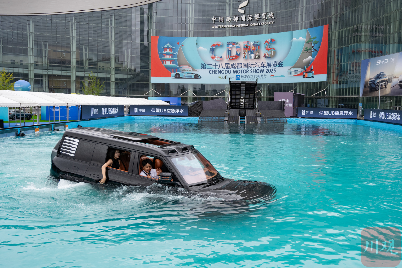 某汽车品牌展示其产品涉水能力。