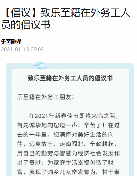 “为避免“春运”期间返乡人员大规模流动聚集,请您尽量在务工地就地过节、网络拜年,并按照当地疫情防控要求保护好自身安全健康,如有特殊困难,可与当地农民工服务机构或政府部门联系,寻求帮助。”1月13日,乐至县农民工服务中心向乐至籍在外务工朋友发出倡议,号召在外务工人员就地就近过节。