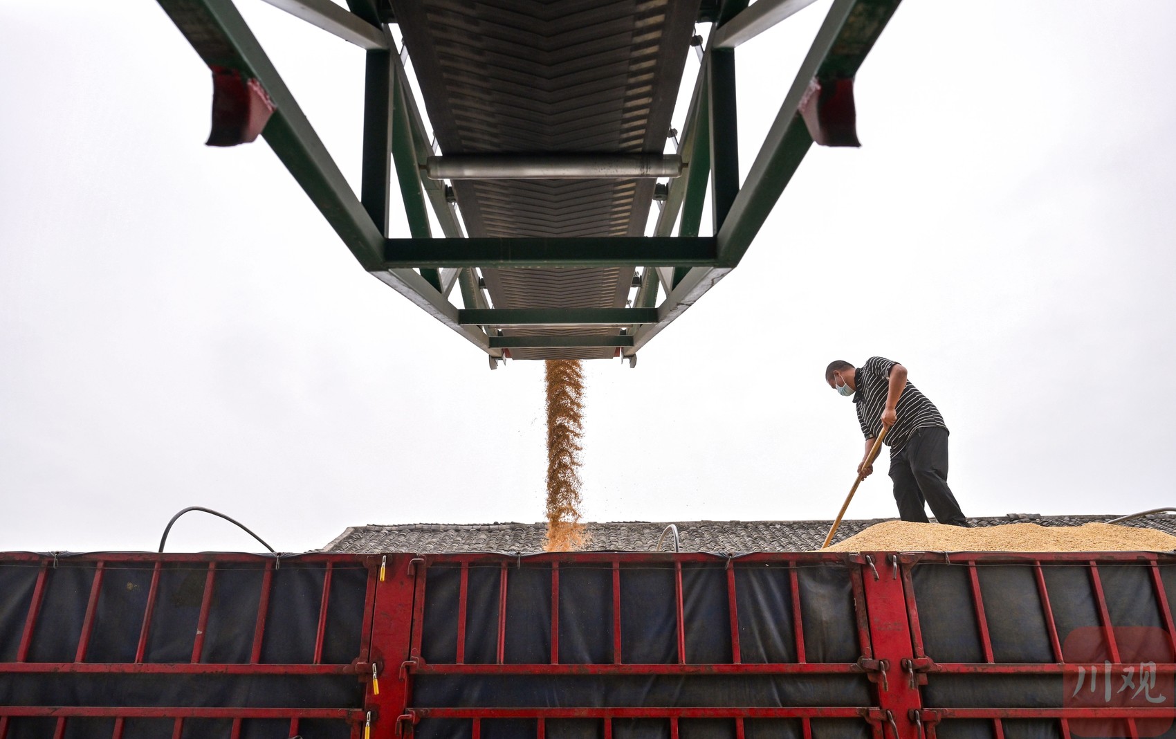 在广安市广安区花桥镇粮食烘干中心,烘干后的稻谷通过传送带源源不断装入货车,即将运往国家粮库。近年来,广安区在“天府粮仓”建设中布局28处烘干中心,日烘干能力近3000吨,为农业增效、农民增收提供坚实保障。而在内江市东兴区郭北镇景坡楼村,村委会大院成了临时晒谷坪,农民趁着晴好天气翻晒新谷。为解决“晒粮难”,东兴区临时开放各镇文化广场、村委会大院等公共区域,确保粮食颗粒归仓。