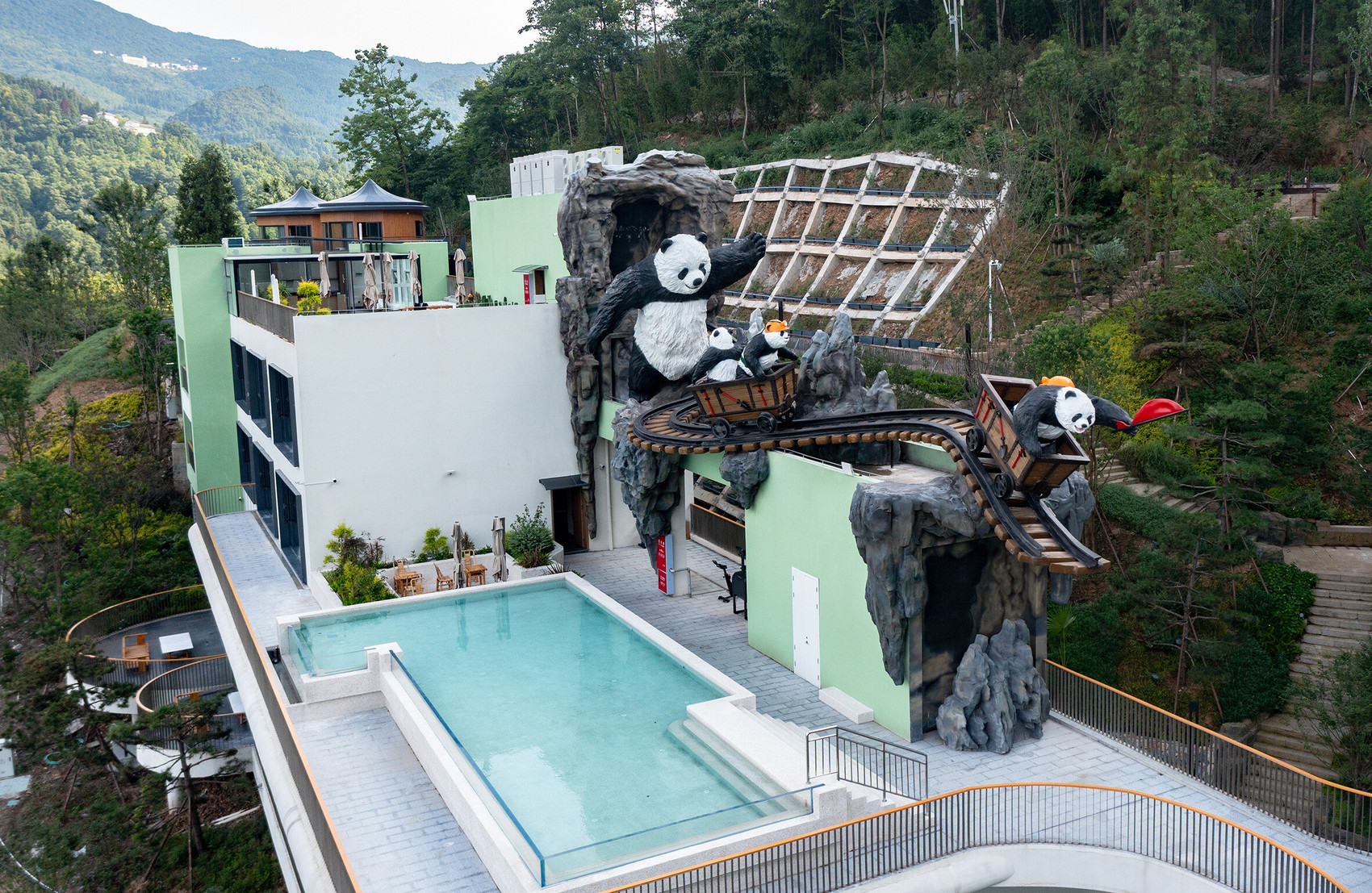 位于华蓥市红岩乡高顶村的“原舍·嘿矿熊猫”民宿,由老龙洞煤矿旧址改造而来。设计师在保留矿坑、崖壁、轨道等工业遗存的基础上,巧妙植入熊猫主题艺术装置,打造出兼具怀旧与创意的沉浸式度假空间,自8月以来持续保持85%以上入住率。