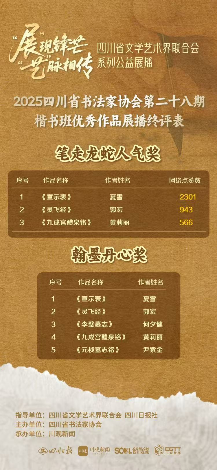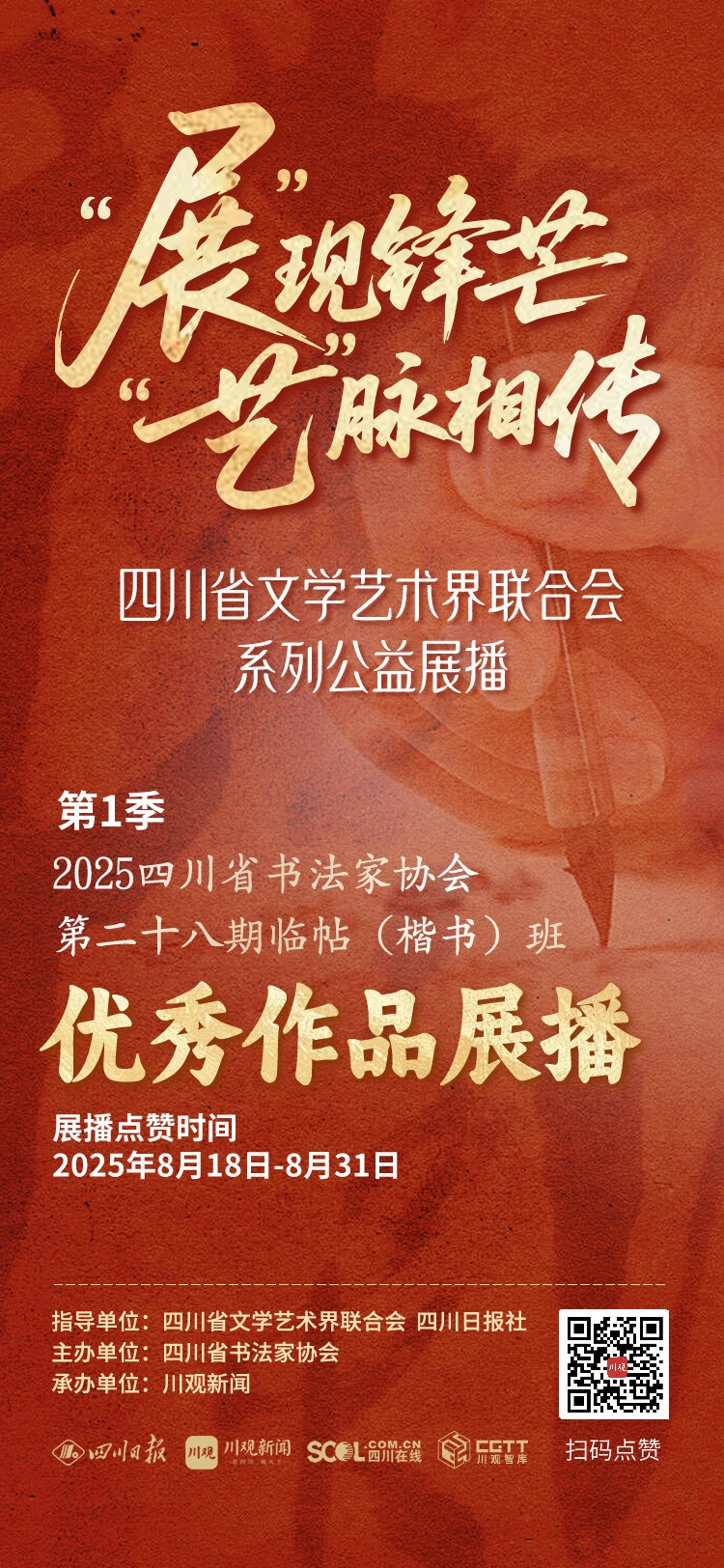 近日,由四川省文学艺术界联合会与四川日报社联合推出的“‘展’现锋芒 ‘艺’脉相传”系列公益展播第一期——2025四川省书法家协会第二十八期临帖(楷书)班优秀作品展播活动圆满落幕。此次展播不仅为公众带来了一场精彩纷呈的书法盛宴,更通过媒体与艺术的深度融合,为传统文化的普及与发展注入了新的活力。