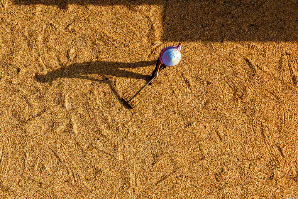 9月2日,山东省临沂市平邑县临涧镇农民在晾晒收获的玉米(无人机照片)。