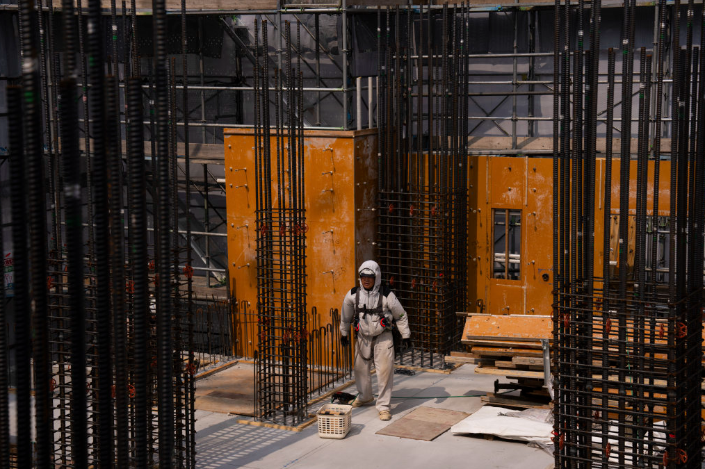 7月9日,在日本东京,建筑工人身着带有风扇的衣服工作。