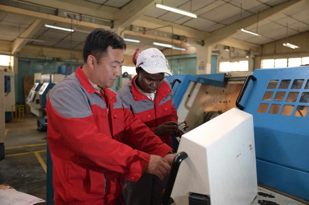 8月29日,在位于肯尼亚首都内罗毕的肯尼亚科技大学,中方指导老师与第十届非洲职业技能挑战赛的参赛选手在数控车床前交流。