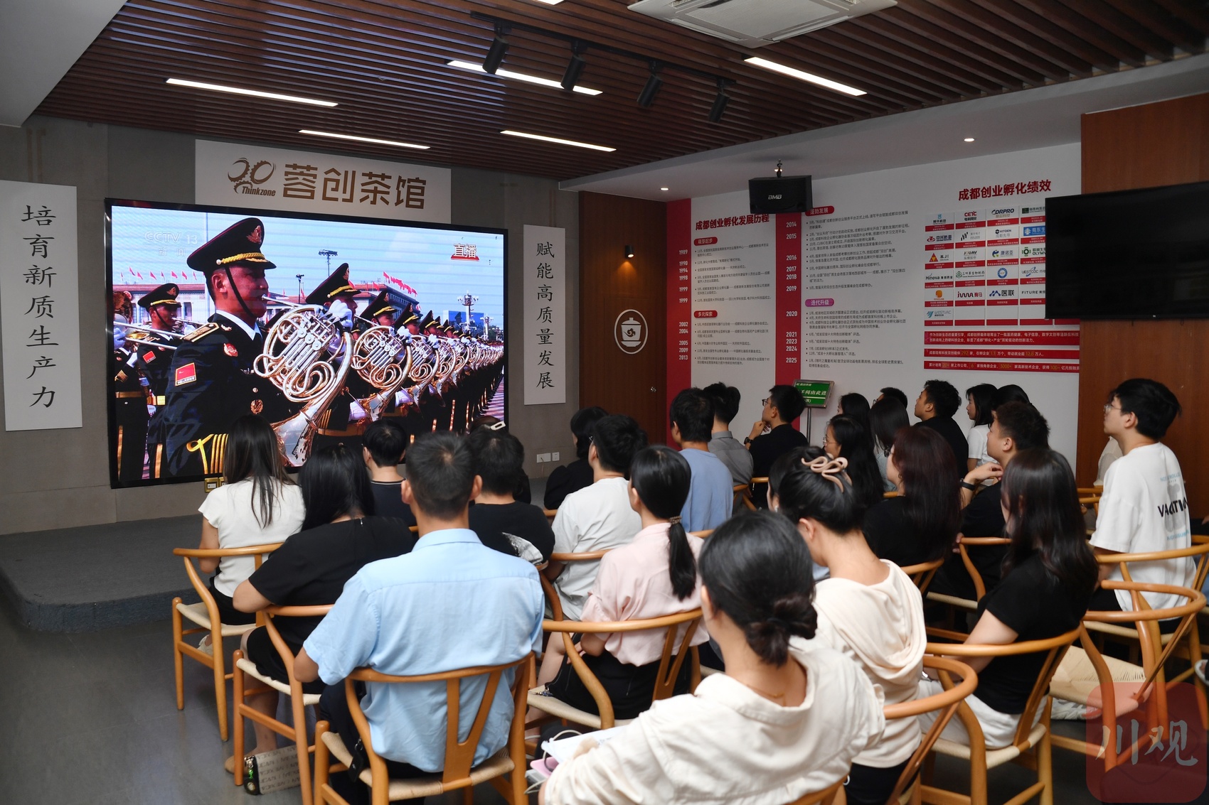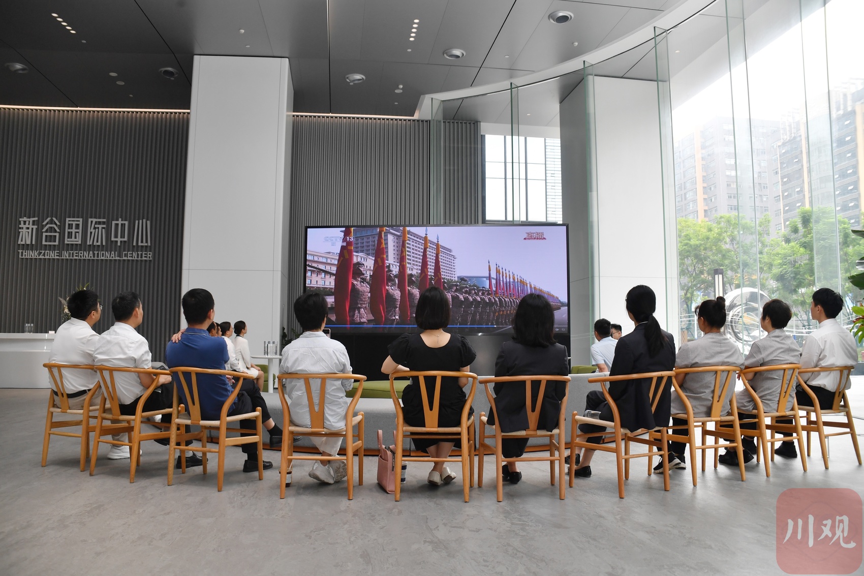 成都高新区天府新谷职工集中观看纪念中国人民抗日战争暨世界反法西斯战争胜利80周年大会。