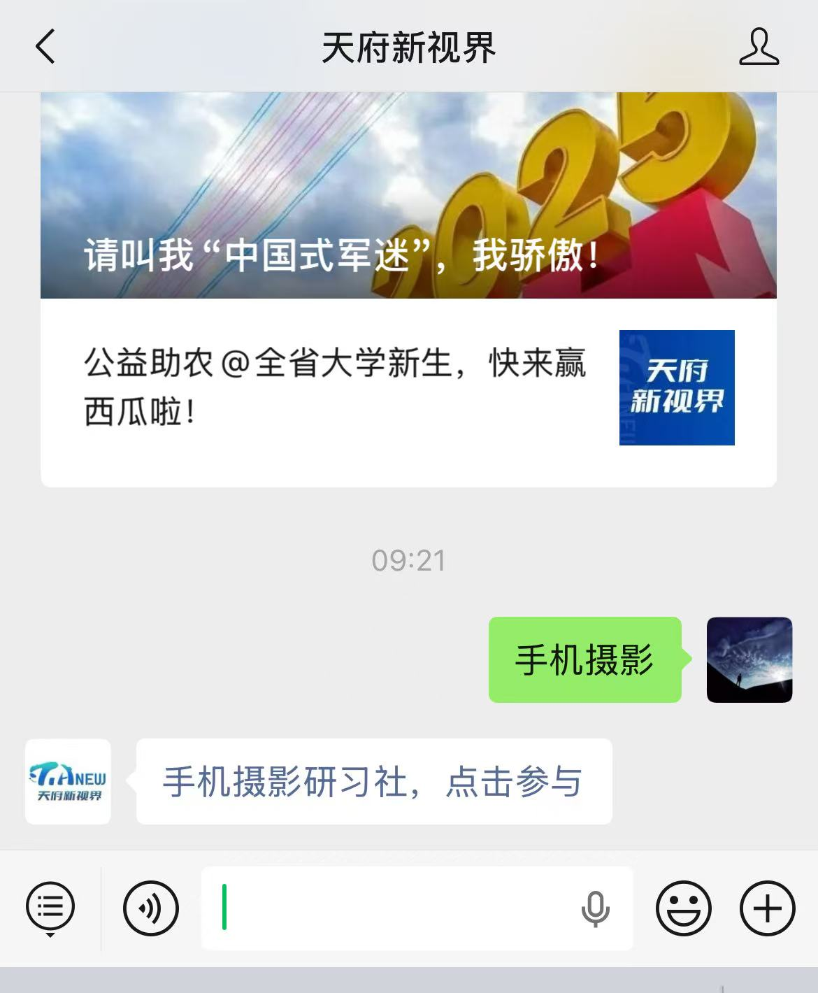 微信搜索“天府新视界”微信公众号,在对话框输入“手机摄影”获取报名链接。