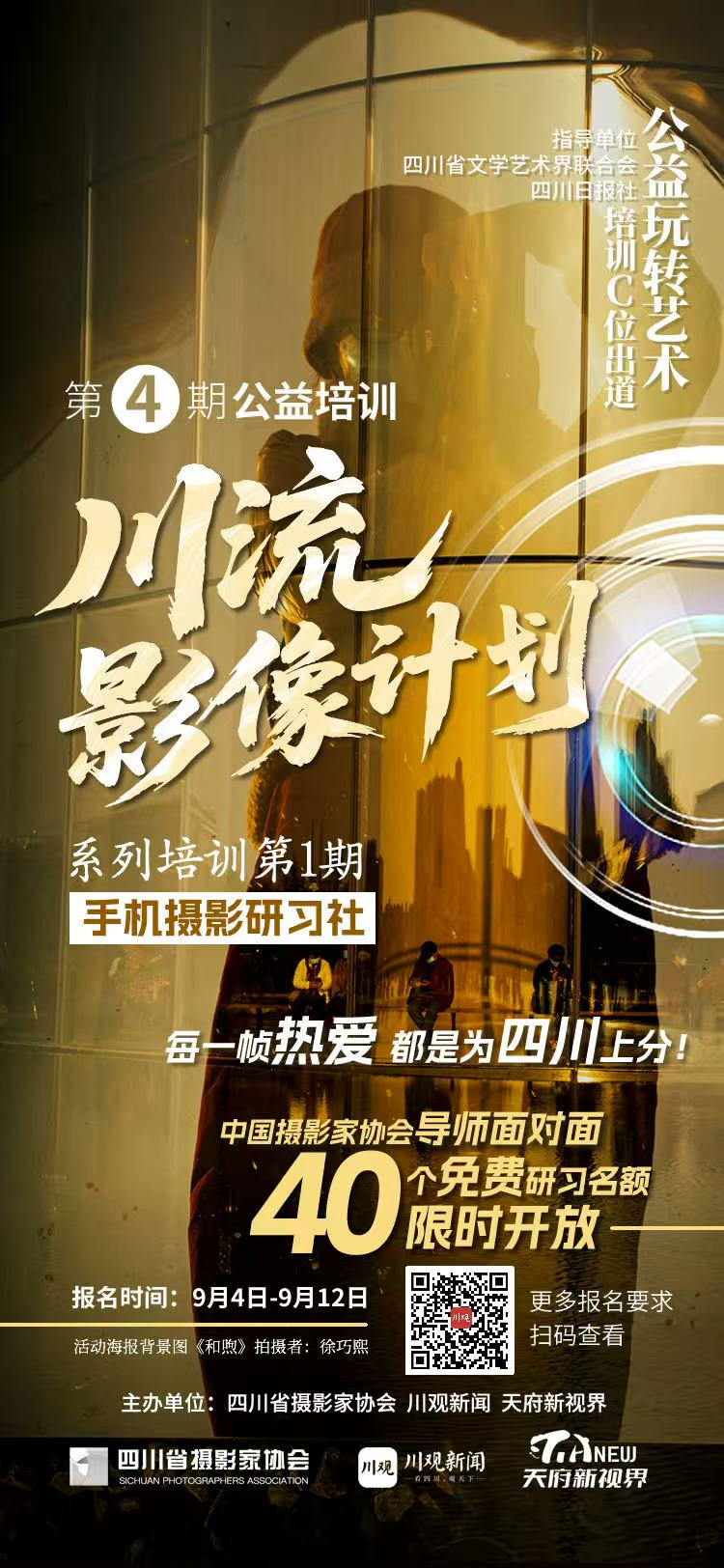 “川流影像计划”,由四川省摄影家协会、川观新闻、天府新视界联合主办。首次公益活动,重磅推出免费公益培训——与中国摄影家协会导师面对面的“手机摄影研习社”,无门槛报名,免费名额多达40个。