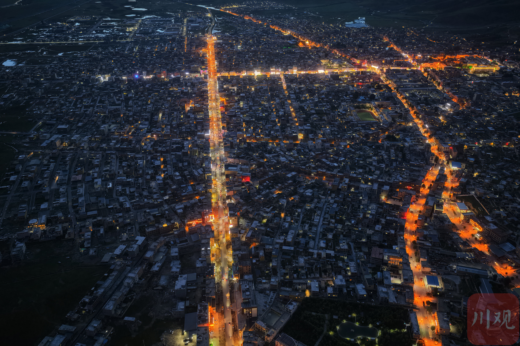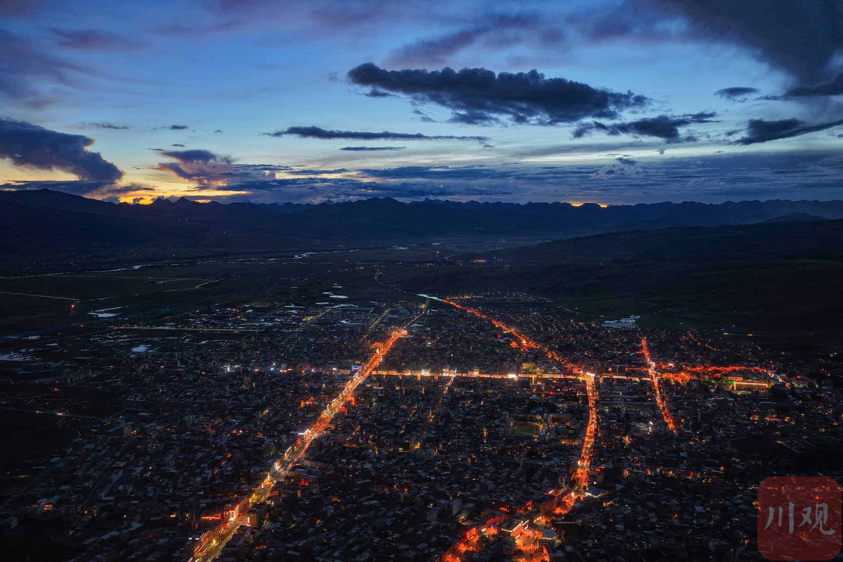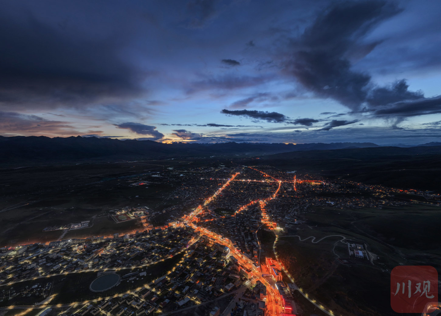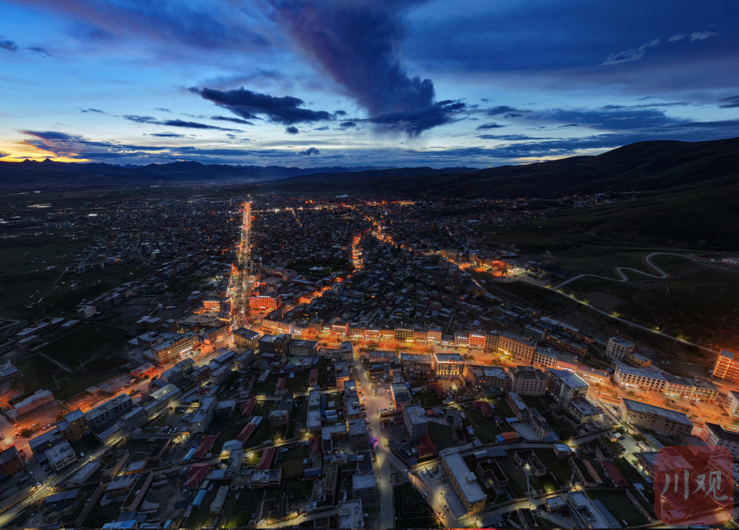 9月3日傍晚,俯瞰四川省甘孜藏族自治州理塘县城夜景。