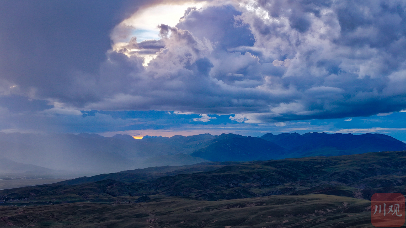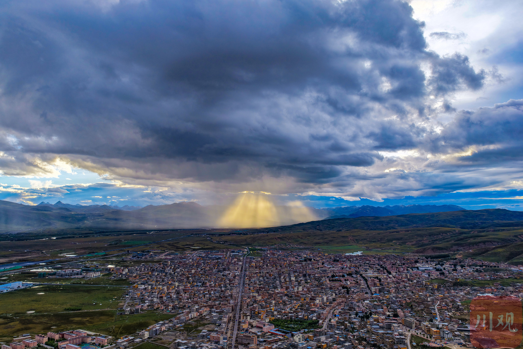 9月3日傍晚,一束光从云层照在四川省甘孜藏族自治州理塘县城。