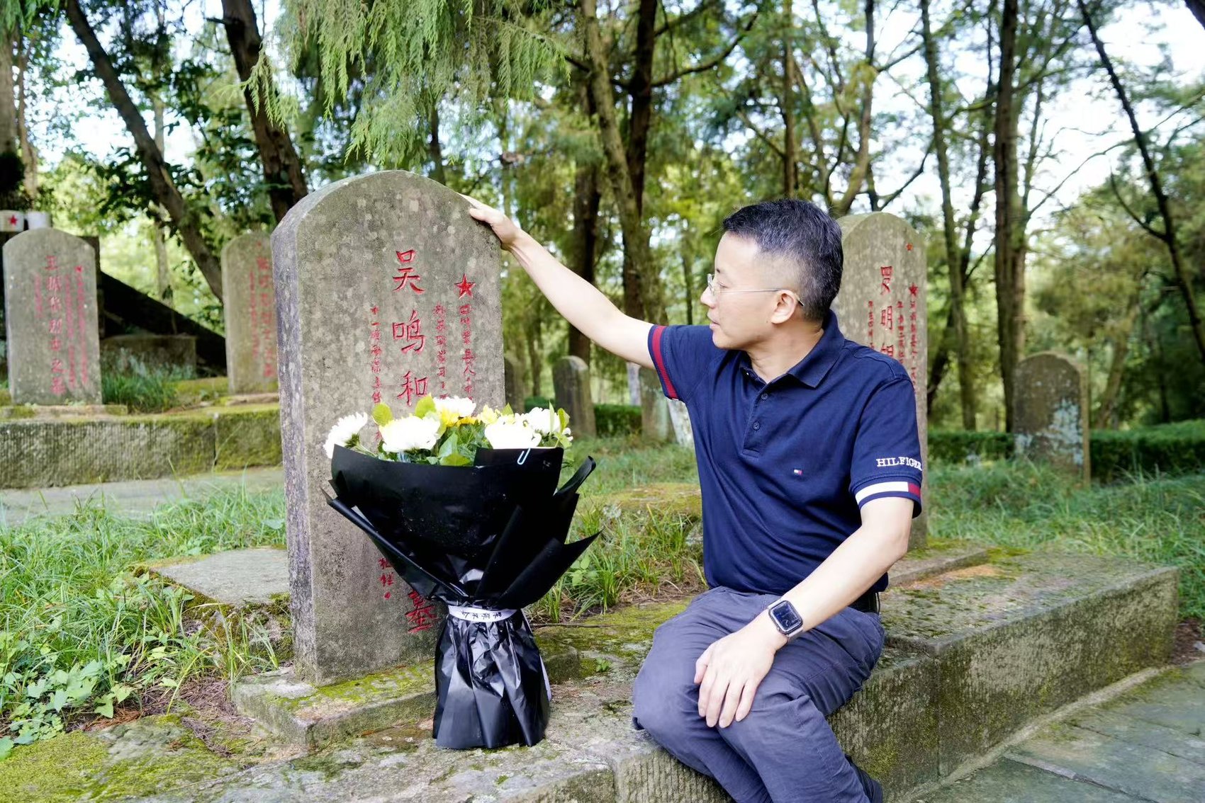 在陵园核心墓区,吴嘀肃立于烈士墓碑前,深情呼唤道:“吴鸣和叔公,您的侄孙吴嘀来看望您了。”默哀、三鞠躬后,他代表全家敬献鲜花。随后,又拿出写好的祭文,与叔公进行了跨越时空的一段对话。