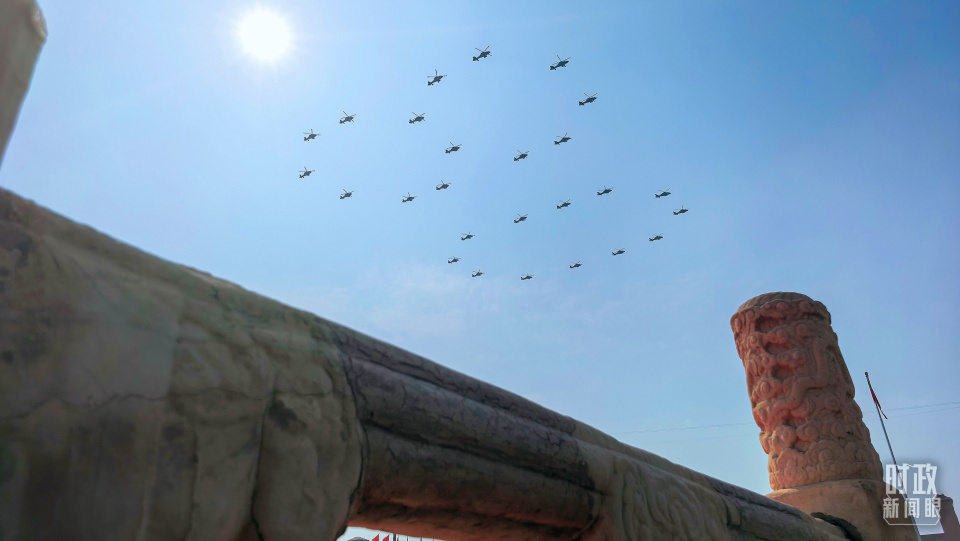 空中护旗梯队率先亮相分列式环节,26架直升机组成巨大的“80”字样。教练机梯队拉出14道彩烟,向中华民族14年可歌可泣的抗战历程致敬,向14亿多中国人民奔向强国复兴的不懈奋斗致敬。