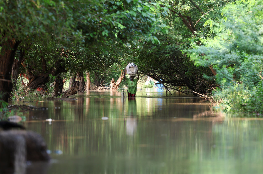 9月3日,在印度首都新德里,亚穆纳河水位上涨后,一名男子涉水前行。