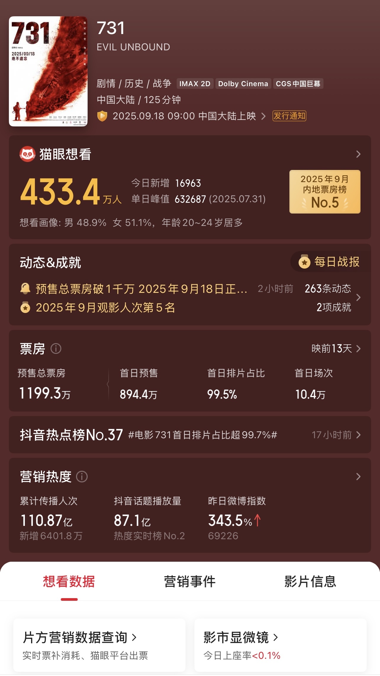 该片在宣传推广方面展现出巨大声量。数据显示,《731》相关内容的总体传播人次已突破110.87亿,仅昨日官宣开启预售后,单日新增传播人次就达到6401.8万,展现出强大的话题热度和观众期待值。这也预示着这部电影可能成为今年秋季档的一大亮点。从排片规模来看,影院经理们对《731》的市场表现寄予厚望。