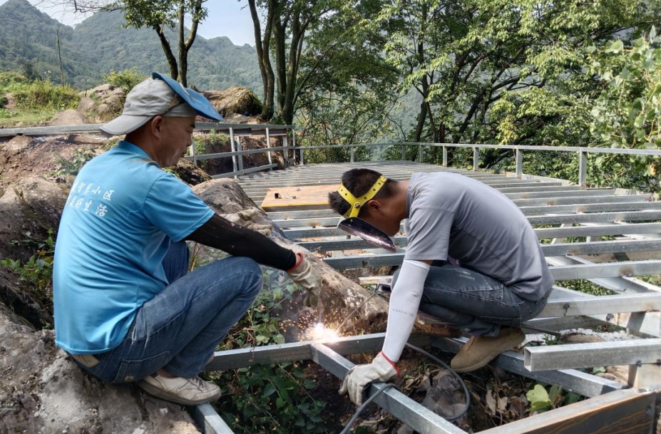 9月2日,海拔约900米的项目现场一派忙碌:20余名建设者忙着搅拌混凝土、铺设管线,生态处理区里挖掘机破碎3米厚花岗岩层开挖化粪池基坑,景观露台处焊花飞溅拼接钢结构,主体建筑内工匠们精准安装木板与玻璃窗,细节拉满。