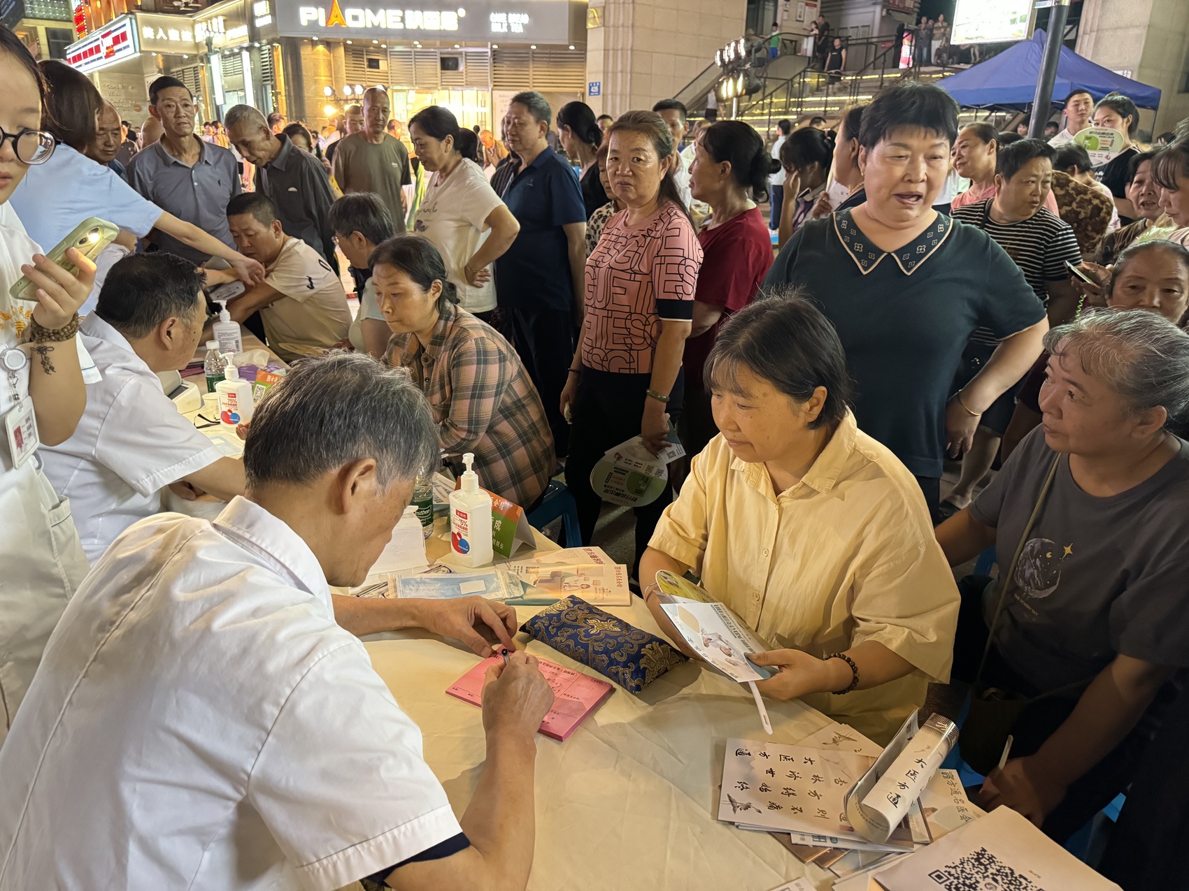 慈善街区设置了义诊区与义卖区。义诊区里,穿着白大褂的医护人员正耐心为老人测量血压、解答健康疑问;义卖区的摊位上,饮料、火锅食材、寿司等商品整齐摆放,摊主们热情地揽客。