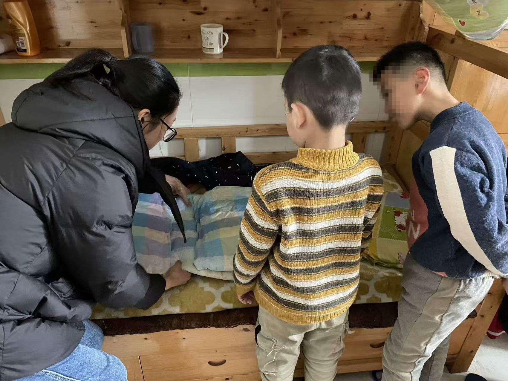 陈潘霞教学生叠被子。