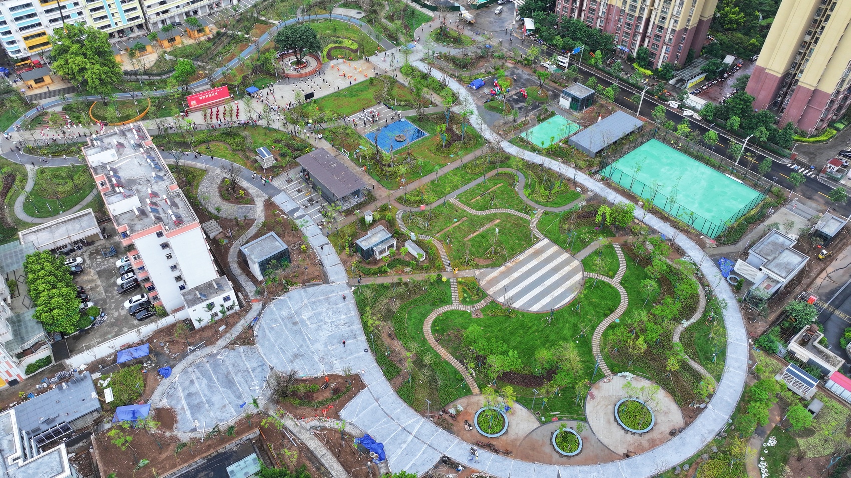 地上,打造60亩的市政公园,建有篮球场、羽毛球场、乒乓球场、亲水景观和人行步道,同时推进4.8万平方米建筑立面整治,既保留80年代建筑轮廓又融入现代美学,以“记忆街区+非遗活化”实现旧城“留魂焕新”。
