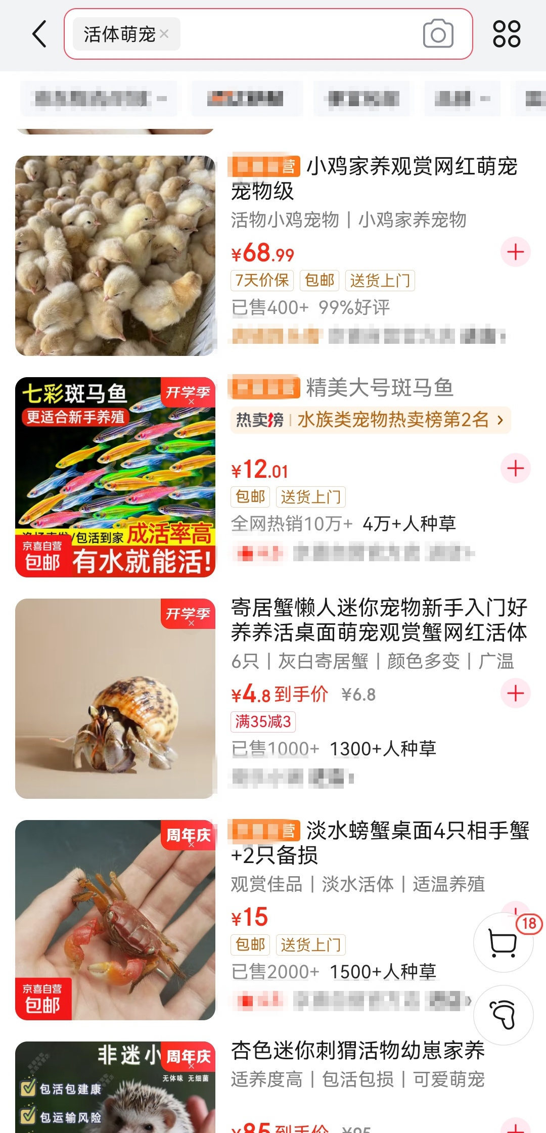 在各大电商平台上搜索“活体萌宠”,会弹出大量待售动物,包括猫、狗、鹦鹉、仓鼠、金鱼等热门宠物。销售这些宠物的网店通常分布在全国各地,但大多数都表示,能够寄送的范围覆盖全国。其购买流程与一般商品无异,下单后即可通过快递或托运发货。