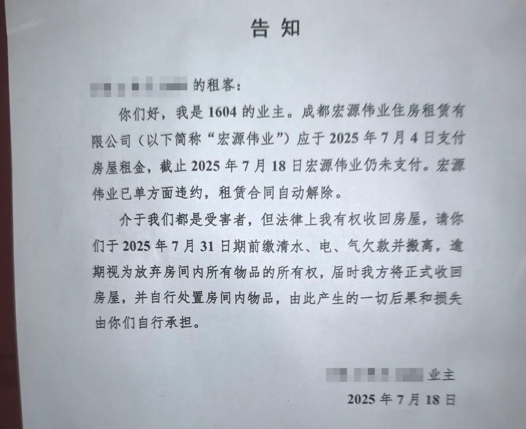 在“《住房租赁条例》遏制行业乱象”系列报道①中,消费质量报对成都宏源伟业住房租赁有限公司(以下简称宏源伟业)爆雷事件进行了追踪报道。在该事件中,权益受到损害的不仅有众多租客,不少房东也损失惨重。