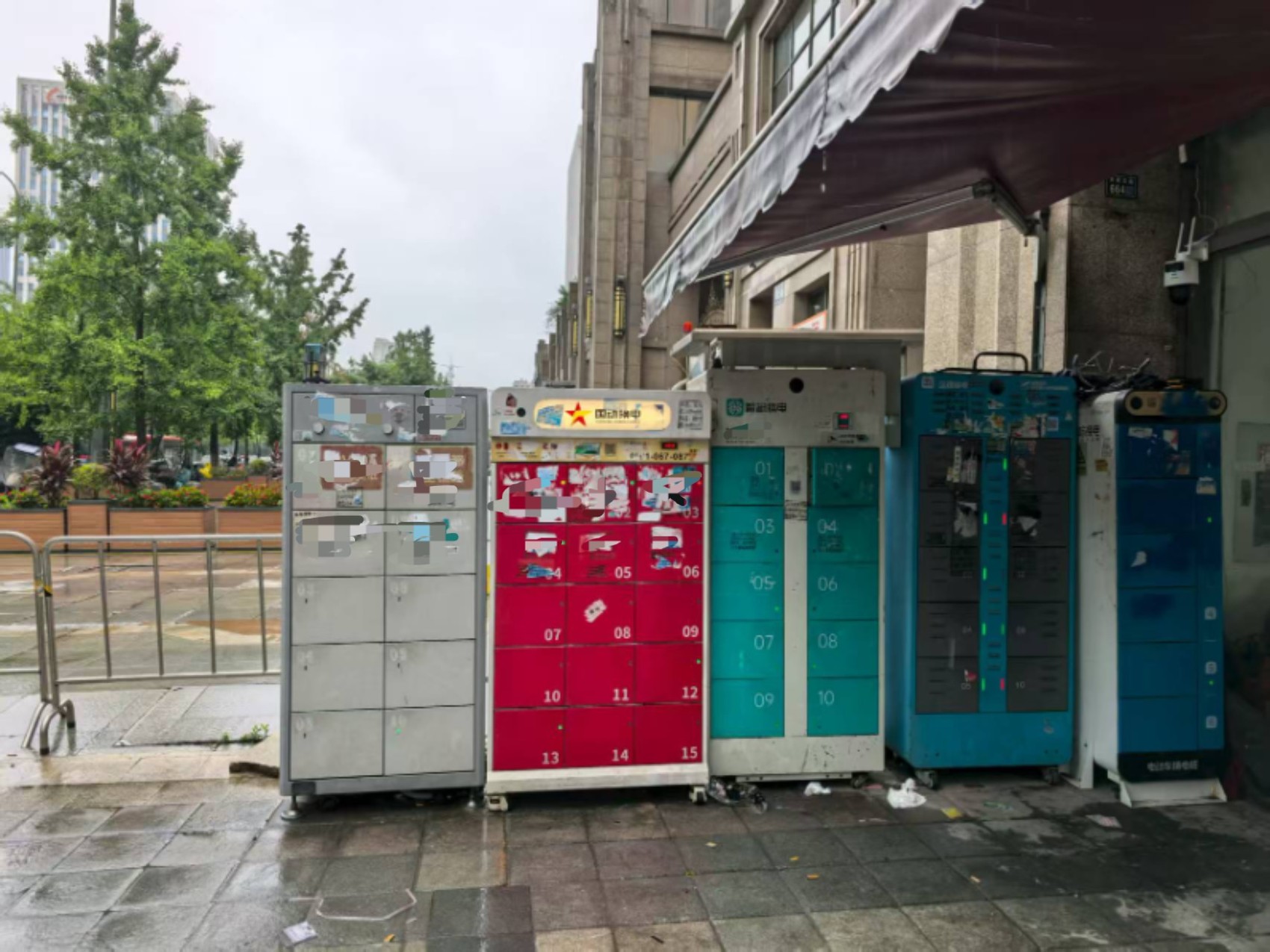 朗基·天香小区1号门附近,摆放着多个共享充电柜。