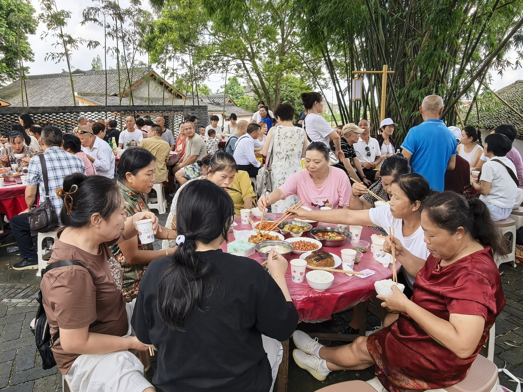 中午时分,“永丰八宝·豆花宴”在稻香中热闹开席。现场40桌坝坝宴整齐排开,村民与游客围坐一堂,一边品尝豆花、稻香鸡等永丰特色农家菜,一边畅谈丰收年景,浓浓乡情在欢声笑语中流淌。