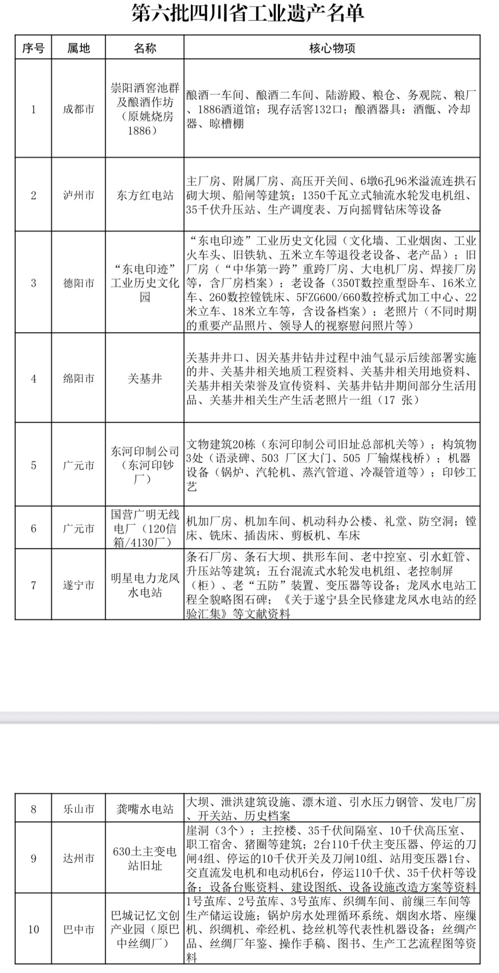 工业遗产是工业文化的重要载体,记录了工业化进程不同阶段的重要信息,承载了行业和城市的历史记忆和文化积淀。“本次获评的工业遗产,反映了四川不同历史时期的工业特色和成就,行业涉及面广,特别是重大水利水电设施评选数量多,三线建设工业遗产占比大。”省经济和信息化厅新兴产业处相关负责人介绍。