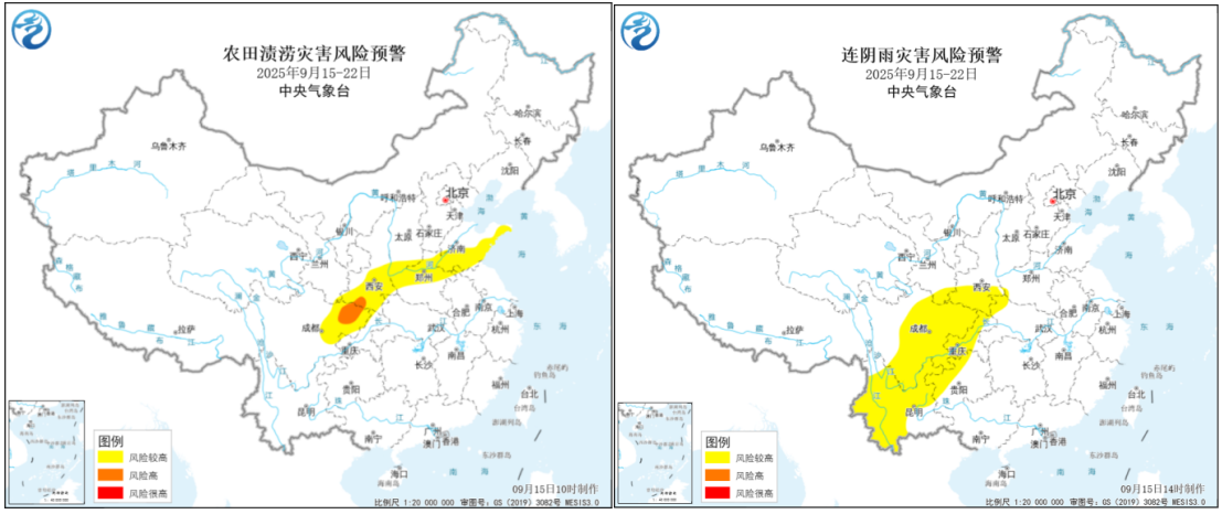 农业农村部和中国气象局9月15日联合发布农田渍涝和连阴雨灾害风险预警,提示:预计9月15日至22日,四川东部农田渍涝风险较高(黄色预警),四川东北部农田渍涝风险高(橙色预警),可能导致低洼农田积水,造成旱地作物根系早衰,部分地区作物可能出现倒伏。四川秋收连阴雨风险较高(黄色预警),不利于作物收获晾晒。建议及时排涝降渍和避雨抢收成熟作物,减轻渍涝和连阴雨危害。