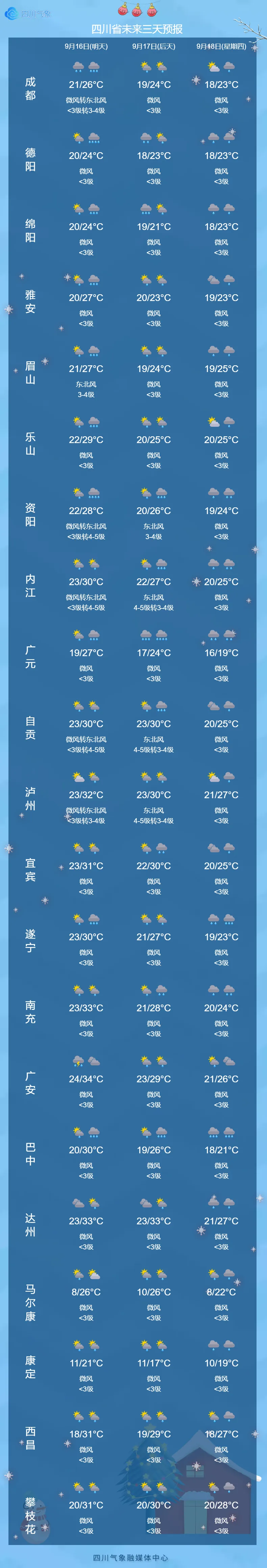 中央气象台预计:9月15日20时至16日20时,四川中部局地有雷暴大风或冰雹天气;9月16日20时至17日20时,四川中东部部分地区有强对流天气;9月17日20时至18日20时,四川中东部部分地区有强对流天气。