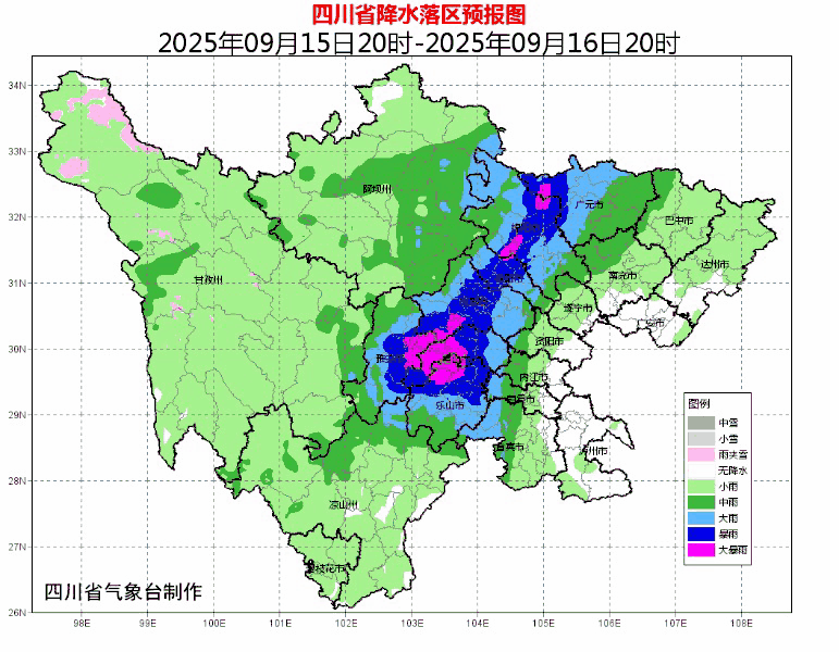 综合中央气象台和四川省气象台最新预报,从今天晚上开始到23日,“雨雨雨”是贯穿四川各地的天气旋律。其中:9月15日晚上到18日盆地有小到中雨,西部、北部和中部的部分地方有大雨到暴雨,局部大暴雨;19到23日盆地北部、中部、南部有中到大雨,局部暴雨到大暴雨;本周内川西高原和攀西地区大部分地方有小雨到中雨,局部大雨。