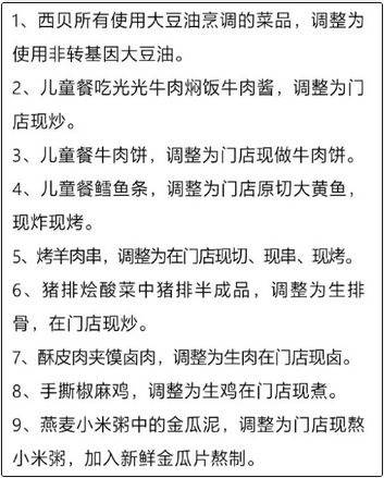 在9月15日发布的道歉信中,西贝提出了多条整改措施,包括将转基因大豆油改为非转基因大豆油,将包括部分儿童餐在内的部分预加工菜品改为门店现制等。