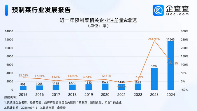 企查查数据显示,国内现存预制菜相关企业(仅统计企业名称、经营范围、品牌产品等含关键词“预制菜、预制食品、即食”的企业)2.8万家。注册方面,近十年相关企业注册量呈整体增长态势,2024年全年注册量首次突破1万家,达1.17万家,同比增长120.43%,达到近十年的峰值。截至目前,今年已注册9788家预制菜相关企业。存量方面,从经营时间来看,成立年限在1年内的相关企业最多,占比43.39%。从地区分布来看,预制菜相关企业主要集中分布在华东地区,占比达40.15%。