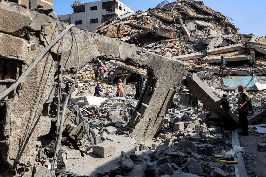 9月15日,人们在加沙城查看遭以军袭击后的废墟。